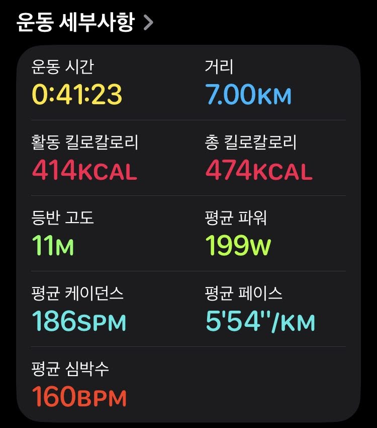 7km 6분대 아래. 매 1km들 전부 5분대로 찎었다. 이정도면 근 10년 안에 가장좋은기록일 것이라고 생각된다. 저번주에 최대심박수 테스트 해본다고 전력질주를 한 탓이 있을려나. 여하튼 이대로 가서 10km 1시간 내로 찍을수 있으면 좋겠다.